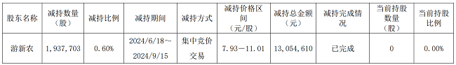 2024年9月,山外山股东游新农通过集中竞价的方式,累计减持公司股份193.77万股,减持股份数量占公司总股本的0.6%,**1305万元。