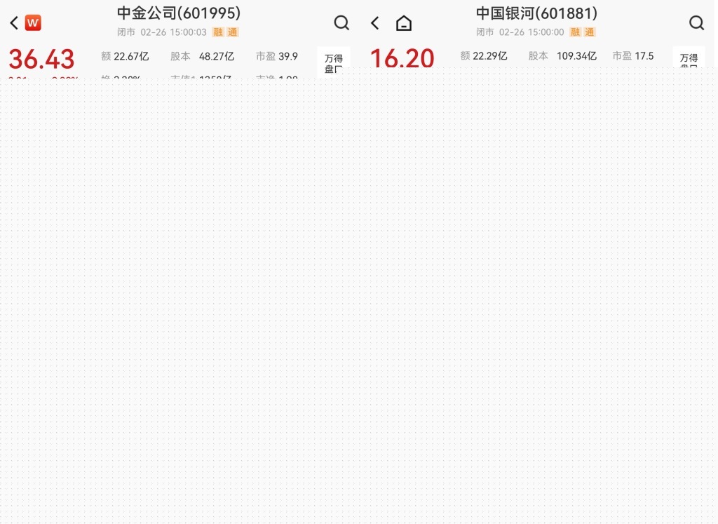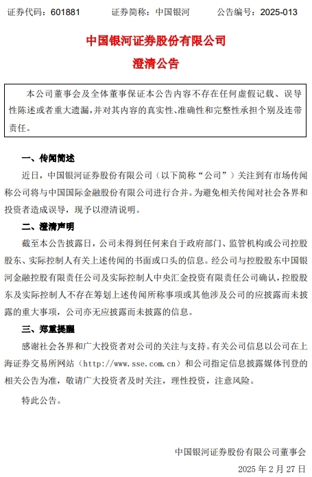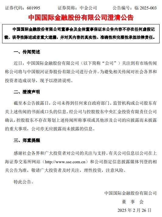2月26日晚间,中金公司发布澄清公告称:“近日,公司关注到有市场传闻称公司将与**银河进行合并。截至本公告披露日,公司未得到**来自政府部门、监管机构或公司股东有关上述传闻的书面或口头的信息。”