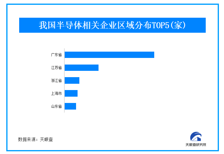 天眼查专业版数据显示,截至目前,我国现存半导体相关企业有33.8万余家。从地域分布上看,广东省、江苏省和浙江省半导体相关企业数量位居前列,分别拥有11.9万余家、4.5万余家、1.9万余家;从成立时间来看,超七成的相关企业成立于5年内,成立于1年以内的相关企业占比超20%。