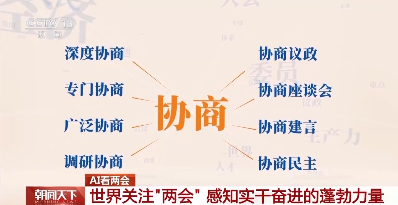 AI进一步对全场问答文本进行深度分析,发现所有名词都直接或间接地围绕一个核心词汇——“协商”。“深度协商”“专门协商”“协商议政”等表述**出现,充分体现了协商民主的广泛和多层次。