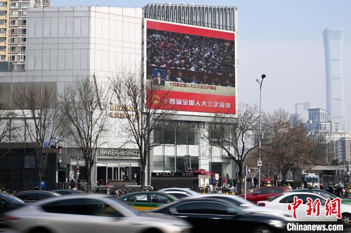 3月5日,十四届****三次会议开幕会在北京人民大会堂举行。图为北京街头大屏幕十四届****三次会议开幕会。 中新社记者 陈楚红 摄