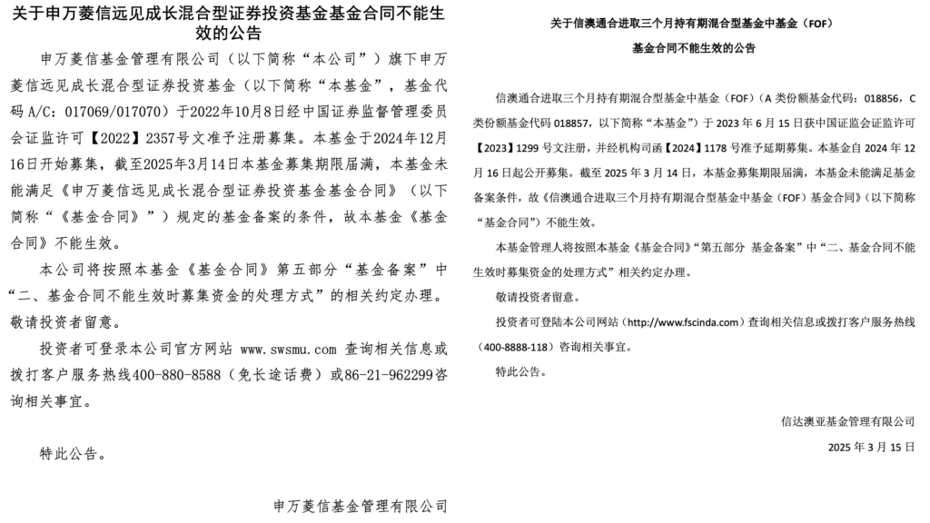近日,信澳通合进取三个月(FOF、申万菱信远见成长同日公告称,截至3月14日,因募集期限届满未能满足基金备案条件,基金合同不能生效。