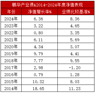 鹏华基金债券投资一部总经理/基金经理祝松在管理中,体现出信用债打底,利用转债和利率债做波段增厚收益的操作特征,代表产品是**债基鹏华产业债A(206018,定位为中低波“固收 ”产品,30%左右的权益仓位上限。据基金定期报告,该基金连续11年(2014-2024净值增长率为正,成为业内备受瞩目的存在。