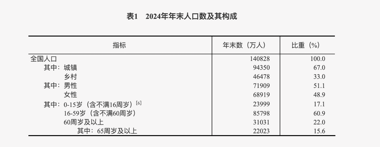 ****发布的数据显示,2024年年末**人口140828万人,比上年末减少139万人。2024年全年出生人口954万人,人口出生率为6.77‰;死亡人口1093万人,人口死亡率为7.76‰;人口自然增长率为-0.99‰。