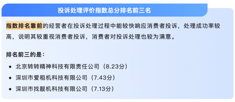 近日,深圳市消费者委员会发布了二手3C电商经营者投诉处理评价指数排行榜,转转、爱租机、找靓机分别位居投诉处理评价指数总分排名前三。该榜单指数排名靠前的经营者在投诉处理过程中能较快响应消费者投诉,处理成功率较高,说明其较重视消费者投诉,消费者对投诉处理也较为满意。