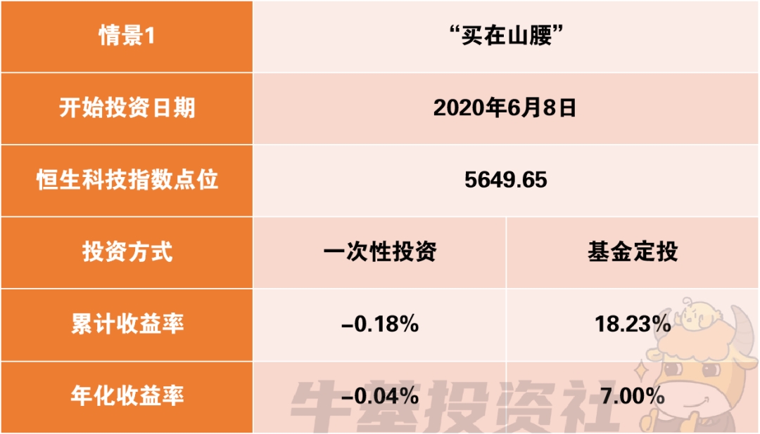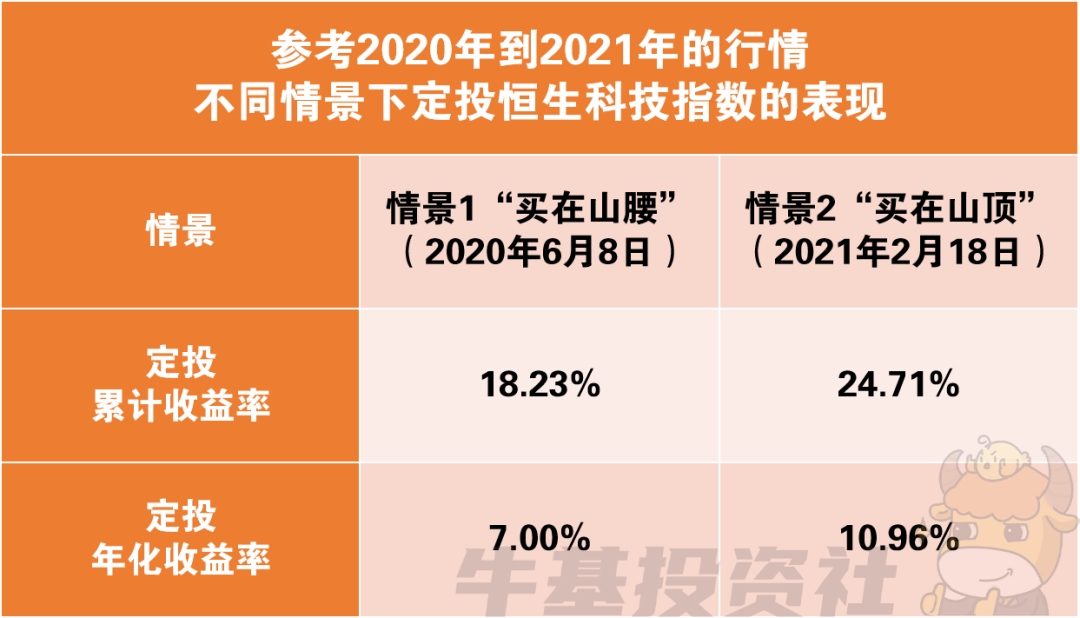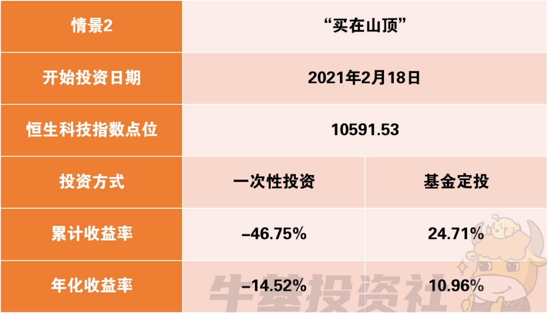 恒生科技指数的历史高点出现在2021年2月18日。如果我们运气不好,一买入市场就开始调整,一次性投资跟定投有多大差别呢?