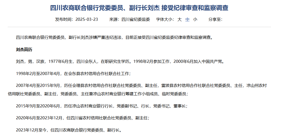 财经3月25日讯 日前,据四川省纪委监委网站,四川农商联合银行党委委员、副行长刘杰涉嫌严重违纪违法,目前正接受四川省纪委监委纪律审查和监察调查。