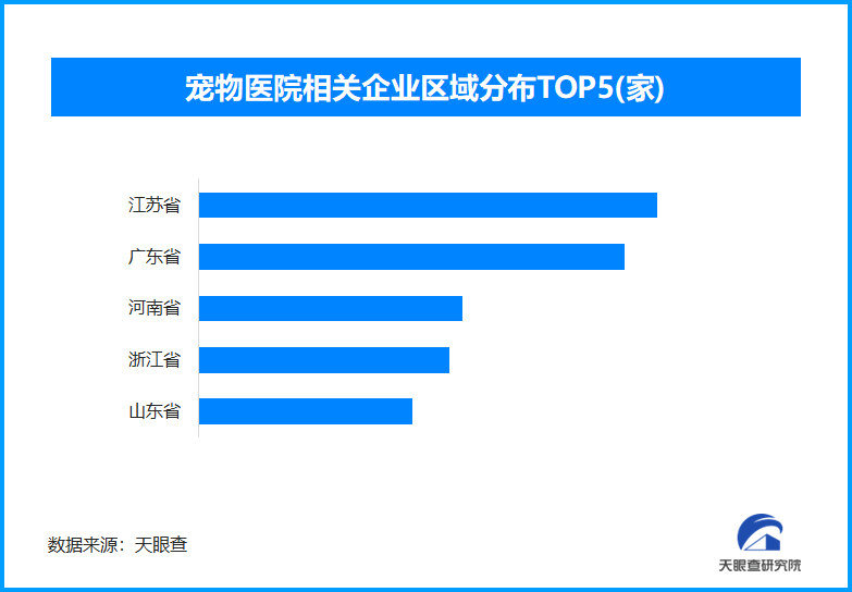 天眼查专业版数据显示,截至目前,我国现存宠物医院相关企业1.2万千余家。从地域分布看江苏、广东及河南三地相关企业数量位居前三,分别为1700余家、1500余家和980余家。