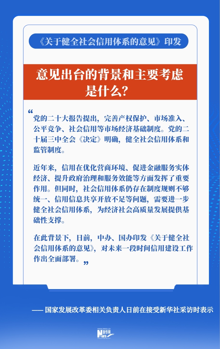 为健全社会信用体系,中办、国办近日印发《关于健全社会信用体系的意见》。4月2日上午,国新办就健全社会信用体系有关情况举行新闻发布会。为何出台《意见》?《意见》部署了哪些政策举措?公众普遍关心的信息安全、守信激励和失信惩戒等问题如何在实践中优化?跟随权威解读,一起了解。