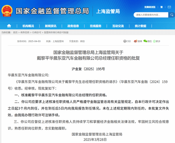 张紫祎财经4月3日讯 今日,**金融监督管理总局上海监管局公布相关批复,核准戴黎平华晨东亚汽车金融有限公司(简称“华晨东亚汽金”总经理的任职**。以下是相关批复正文: