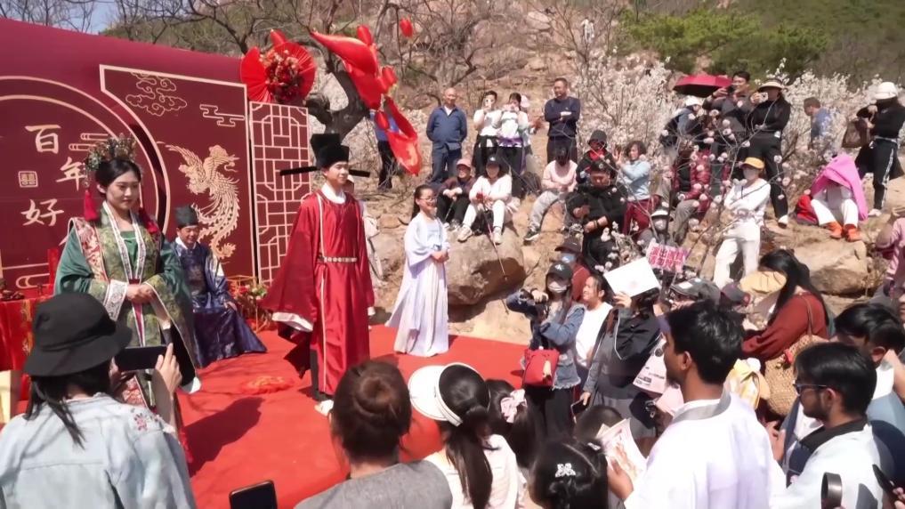 走进山东日照五莲县大旺村,数万株樱桃花次第开放,游客们竞相拍照留念。以宋代文化为主题的剧本游,带游客体验宋代服饰、诗词,感受传统文化的魅力。