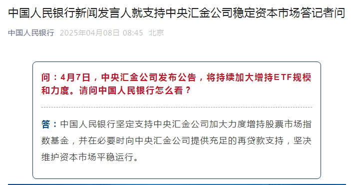 近日,美国政府滥施关税引发全球市场剧烈波动。4月7日,市场迎来“黑色星期一”,A股出现较大跌幅。当日尾盘时分,**汇金发布公告称,坚定看好**资本市场发展前景,充分认可当前A股配置价值,并表示已再次增持ETF,未来将继续增持。