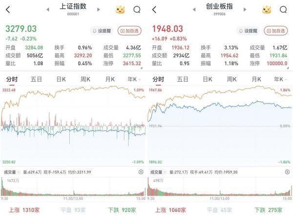 至收盘,上证综指跌0.23%,报3279.03点;科创50指数涨0.85%,报1012.42点;深证成指涨0.51%,报9899.82点;创业板指涨0.83%,报1948.03点。