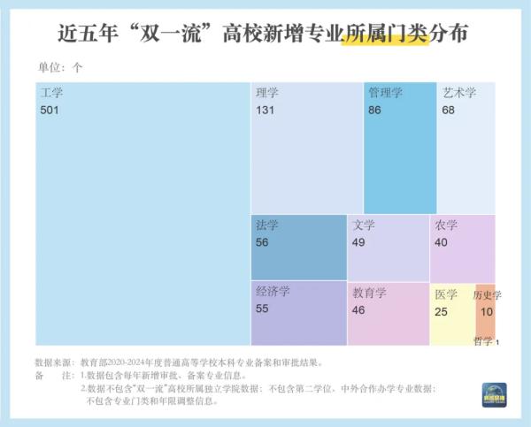 统计显示,近五年“双**”高校新增专业达1068个。其中,工学类501个,占比近半,遥遥**于其他门类,这与工学作为我国**大学科门类的情况相呼应。其次是理学(131个、管理学(86个。