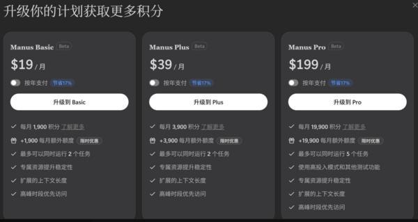 在收费方面,Manus分别提供了每月19美元的基础计划、每月39美元的Plus计划和每月199美元的Pro计划。以基础计划为例,用户每月将获得1900积分,可以在购买积分时享受额外优惠,最多可以同时运行2个任务。