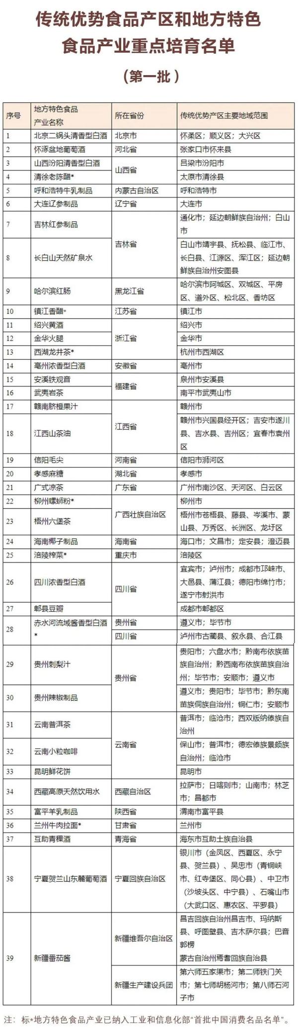 据工业和信息化部官网消息,经省级工业和信息化主管部门推荐、专家评价、网上公示等程序,工业和信息化部确定了传统优势食品产区和地方特色食品产业**培育名单(**批,包括北京二锅头清香型白酒、哈尔滨红肠、江西山油茶、云南小粒咖啡等39个地方特色食品产业及其所在传统优势食品产区。