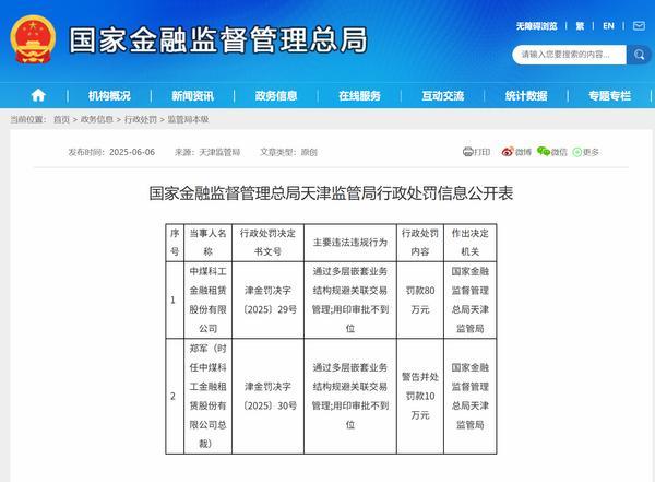 同时,天津监管局对时任中煤科工金租总裁郑军予以警告并处罚款10万元。以下是相关行政处罚信息公开表正文: