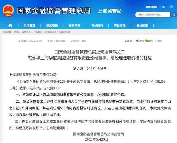 张紫祎财经6月10日讯 昨日,**金融监督管理总局上海监管局关于公布相关批复,核准赖永华上海华谊集团财务有限责任公司(简称“上海华谊集团财务公司”董事、总经理的任职**。以下是相关批复正文:
