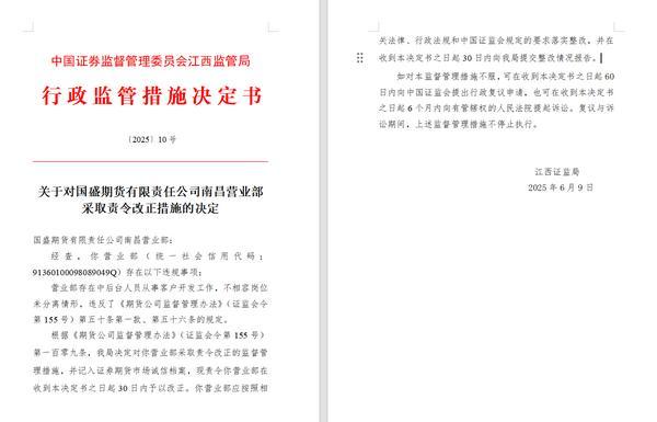 江西证监局根据《期货公司监督管理办法》(证监会令**55号**百零九条,决定对国盛期货南昌营业部采取责令改正的监督管理措施,并记入证券期货市场诚信档案,现责令国盛期货南昌营业部在收到本决定书之日起30日内予以改正。