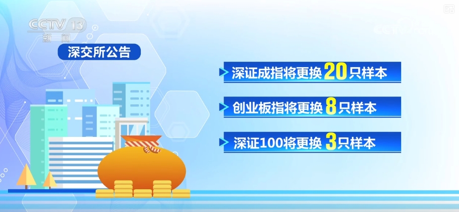 深交所公告,深证成指将更换20只样本、创业板指将更换8只样本、深证100将更换3只样本。中证指数有限公司公告显示,沪深300指数更换7只样本、中证500指数更换50只样本、中证A50指数更换4只样本、中证A100指数更换5只样本、中证A500指数更换21只样本。