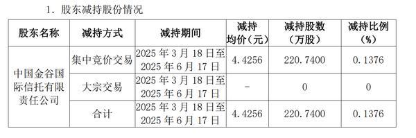 财经6月18日讯 今日,凯撒旅业(证券代码:000796.SZ发布相关公告称,截至2025年6月17日,公司持股5%以上股东**金谷**信托有限责任公司(以下简称“金谷信托”减持计划期限已期满,公司收到金谷信托《股份减持实施情况告知函》。将本次股份减持计划实施情况公告如下: