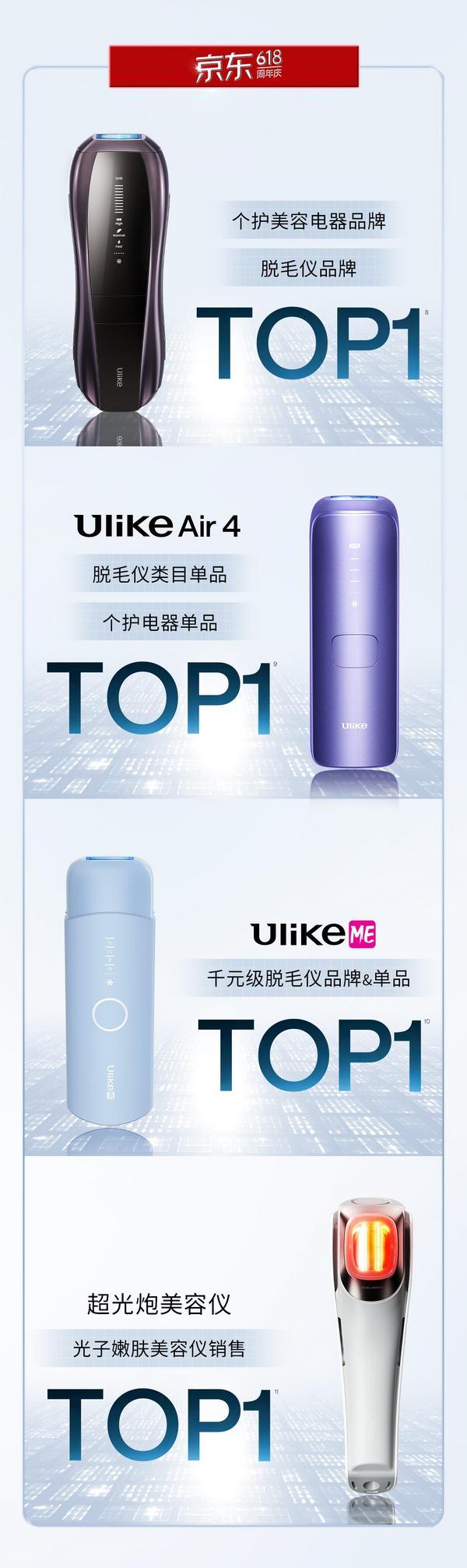 Ulike斩获京东平台“个护美容电器品牌”、“**仪品牌”、“**仪类目单品”、“个护电器单品”、“千元级**仪品牌&单品”等多个榜单**;Ulike超光炮美容仪获得“光子嫩肤美容仪”销售**。