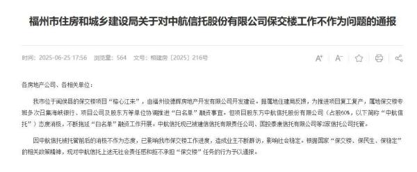 福州市住建局表示,因中航信托被托管前后的消极不作为态度,已影响福州市保交楼工作进度,造成业主不断群访,影响社会稳定。根据**“保交楼、保民生、保稳定”的相关政策精神,现对中航信托上述无社会责任感和拒不承担“保交楼”任务的行为予以通报。
