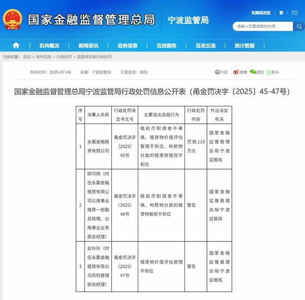 财经7月4日讯 今日,**金融监督管理总局宁波监管局(简称“宁波监管局”公布相关行政处罚信息披露,永赢金融租赁有限公司(简称“永赢金租”因存在租前尽职调查不审慎、租赁物价值评估管理不到位、构筑物分类的租赁物管控不到位的主要违法违规行为,宁波监管局对其罚款110万元。