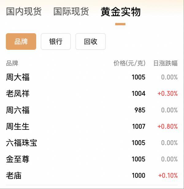 **足金饰品报价大多在千元上方。周生生足金饰品报价1007元/克,相比前一日的999元每克上涨8元;六福珠宝、金**、周大福足金饰品报价1005元/克,与前一日保持一致;老凤祥足金饰品报价1004元/克,相比前一日1001元每克上涨3元;周六福足金饰品报价仍维持在千元以下,报价985元/克,与前一日保持一致。
