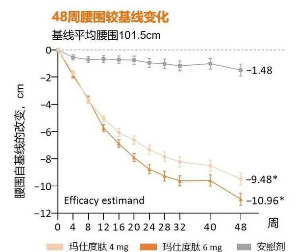 图2. 玛仕度肽和安慰剂**48周后腰围较基线变化的百分比[6]