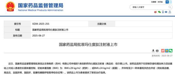 2025年6月27日,玛仕度肽注射液(信尔美®)获得**药品监督管理局(NMPA批准上市,用于**肥胖或超重患者的长期体重管理[1]。