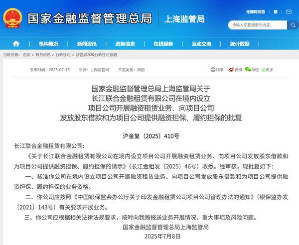 财经7月16日讯 昨日,**金融监督管理总局上海监管局发布相关批复,核准长江联合金融租赁有限公司(简称“长江金租”在境内设立项目公司开展融资租赁业务、向项目公司发放股东借款和为项目公司提供融资担保、履约担保的业务**。以下是相关批复正文: