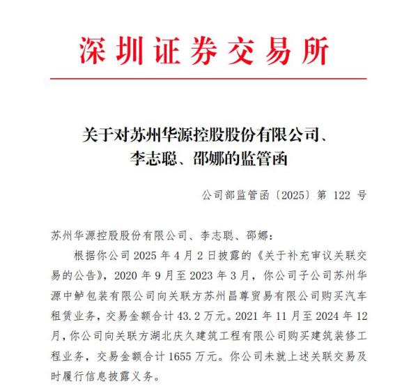 《监管函》显示,根据华源控股2025年4月2日披露的《关于补充审议关联交易的公告》,2020年9月至2023年3月,华源控股子公司苏州华源中鲈包装有限公司向关联方苏州昌尊贸易有限公司购买汽车租赁业务,交易金额合计43.2万元。2021年11月至2024年12月,华源控股向关联方湖北庆久建筑工程有限公司购买建筑装修工程业务,交易金额合计1655万元。
