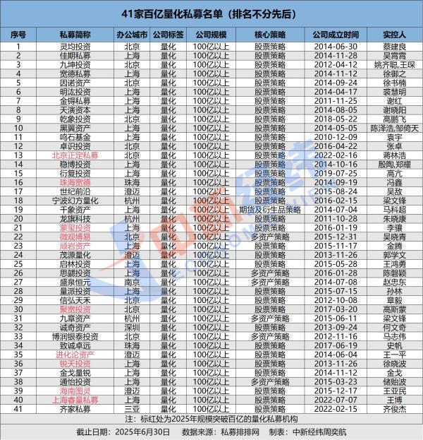 中新经纬梳理发现,2025年上半年,百亿量化私募新增10家,减少2家。除了近期蒙玺投资、微观博易新晋成为百亿量化私募外,包括北京正定私募基金管理合伙企业、上海顽岩私募基金管理有限公司、海南进化论私募基金管理有限公司等8家公司的管理规模也在今年突破百亿;而上海磐松私募基金管理有限公司、上海波克私募基金管理合伙企业则掉出百亿私募阵营。