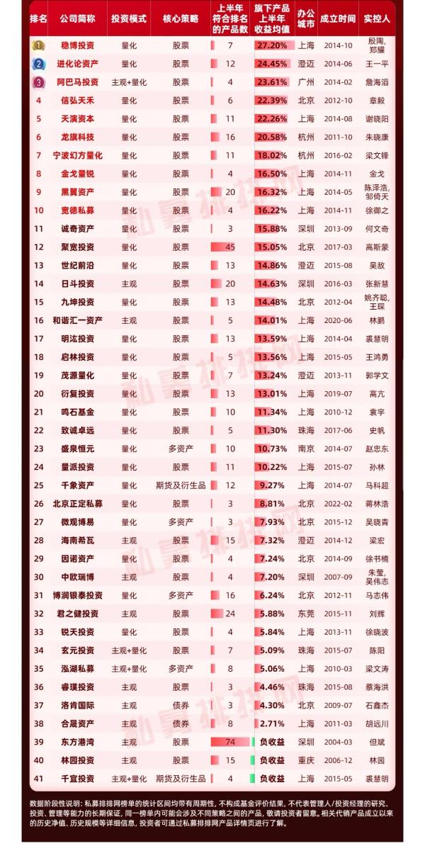 除此之外,由王一平创立的进化论资产以24.45%的收益均值位居第二,信弘天禾、天演资本居于其后,旗下产品上半年收益均值分别为22.39%和22.26%。