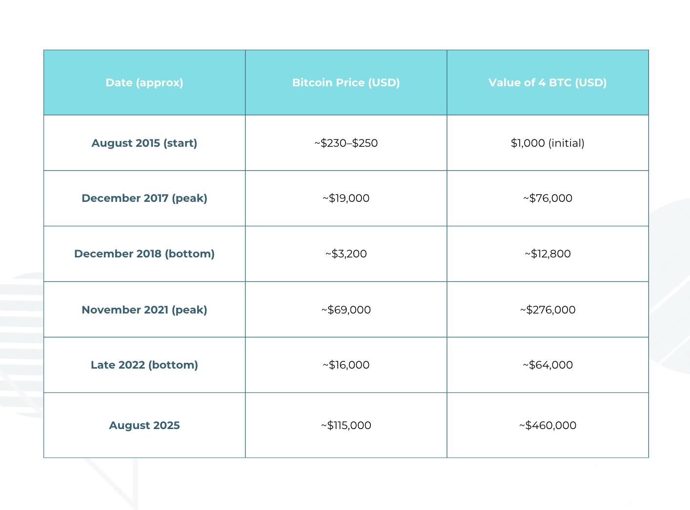 2015年,比特币价格徘徊在230–250美元,你的1000美元大约可以买到4枚BTC。快进到今天,Bitcoin价格约为11.5万美元,这4枚BTC现在价值约46万美元。如果你买入时价格更低(约220美元),你能持有接近4.5枚BTC,价值超过50万美元。