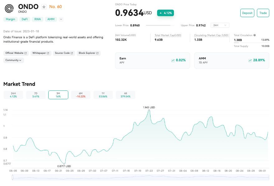ONDO的总供应量为100亿**,截至2025年9月,目前流通量约为31.5亿。