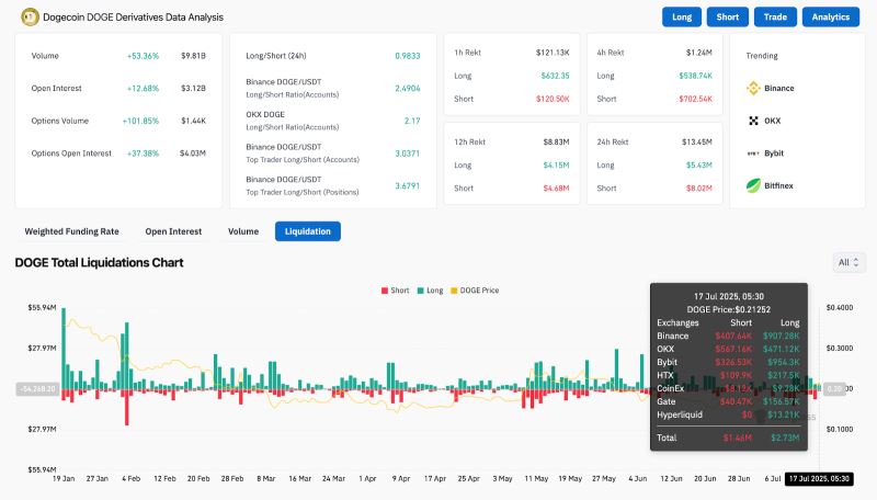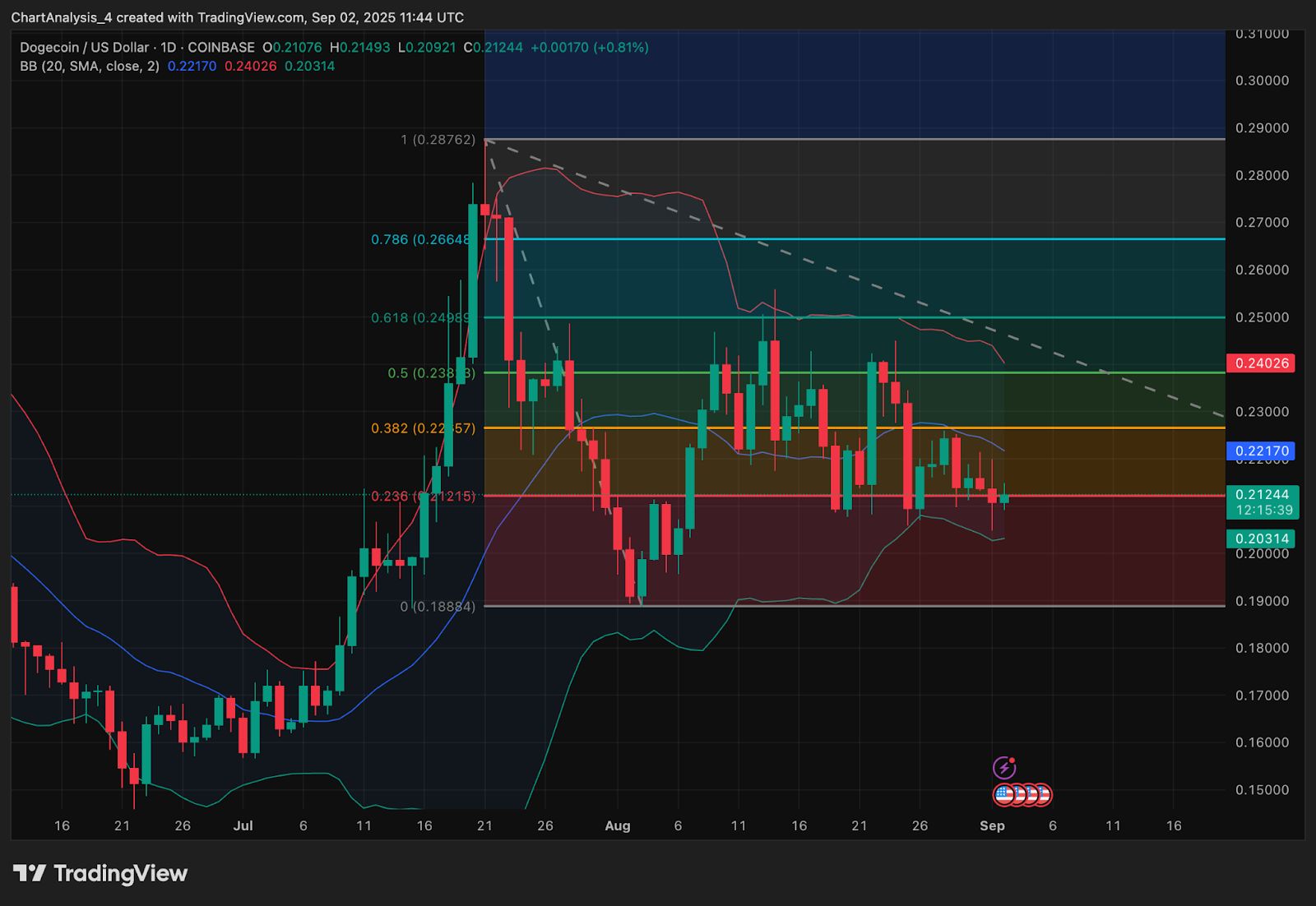 狗狗币今日交易价为 0.212 美元,此前一周波动剧烈,一度反复守住 0.21 美元关口。尽管买家成功阻止了进一步下跌,但势头仍受限于上方阻力位 0.22 至 0.23 美元附近。