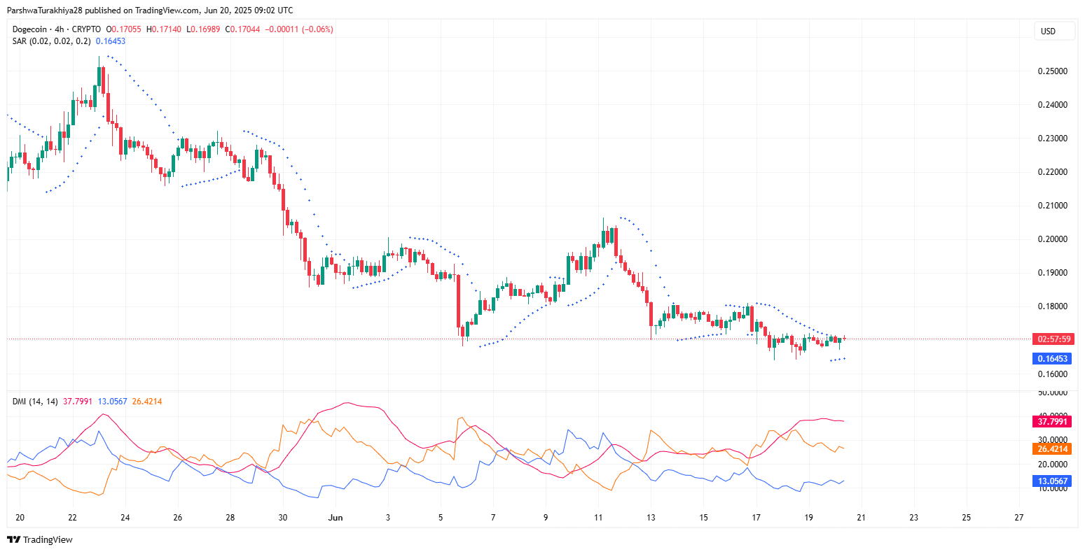 日线图显示,狗狗币仍然受困于可追溯至 2025 年 2 月的下降趋势线之下。多头最近试图突破 0.18 美元附近,但未能维持。