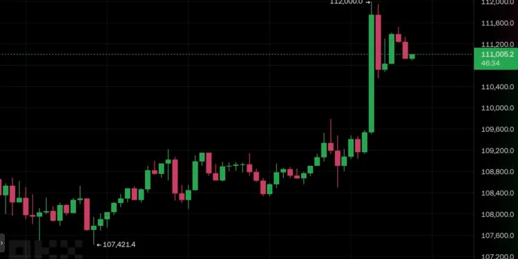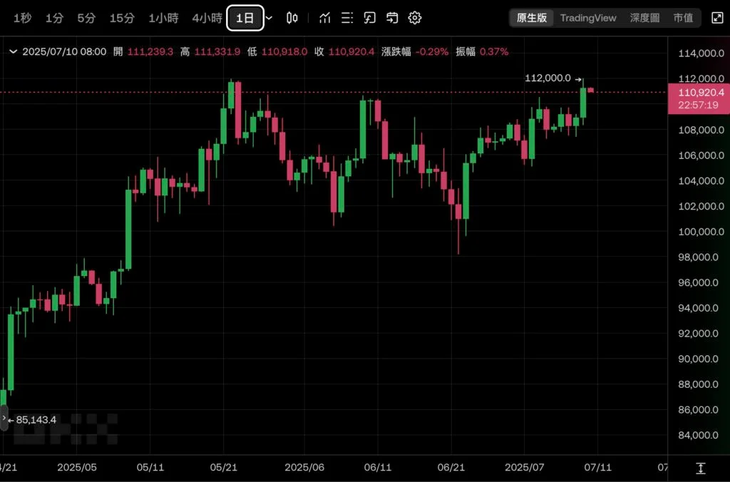 比特币(Bitcoin)于台湾时间今日凌晨三点一度飙升至112,000美元以上,这是自5月22日以来再次打破历史高点。根据OKX数据显示,截至发稿时比特币略有回落,现报110,920美元。