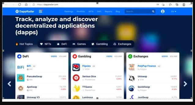 DappRadar是一个**DApp数据查询的平台,汇聚业内各大DApp信息,**用户可以直接浏览。首页分为游戏、DeFi、**、DEXs交易所、社交等几大热门板块。