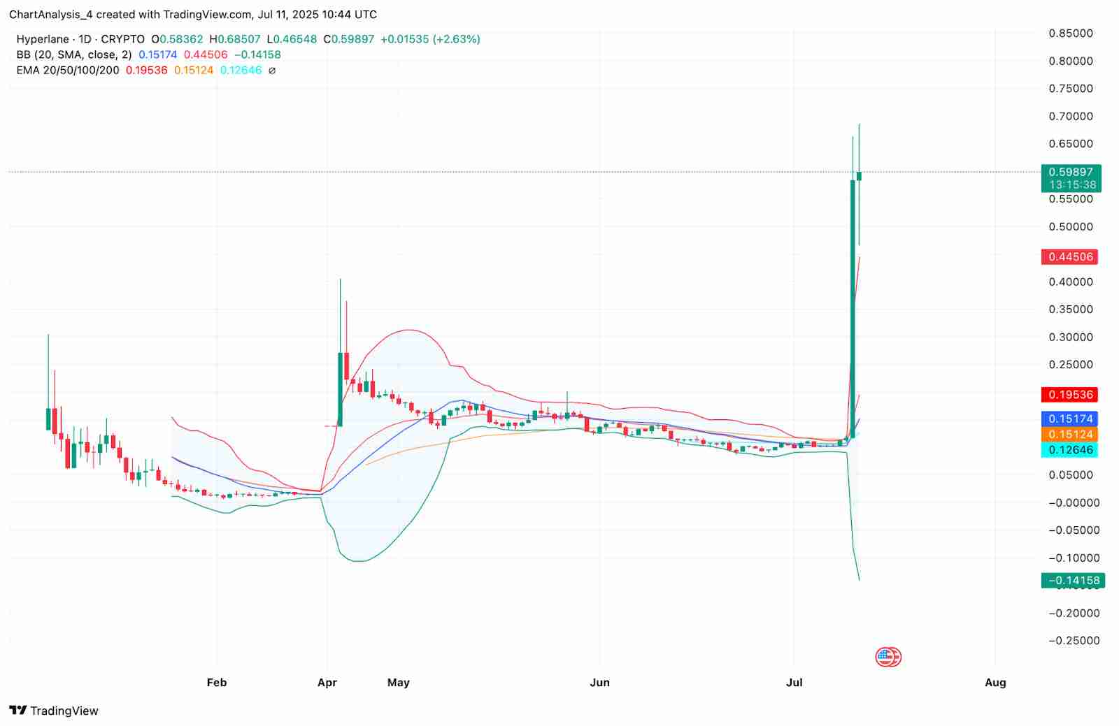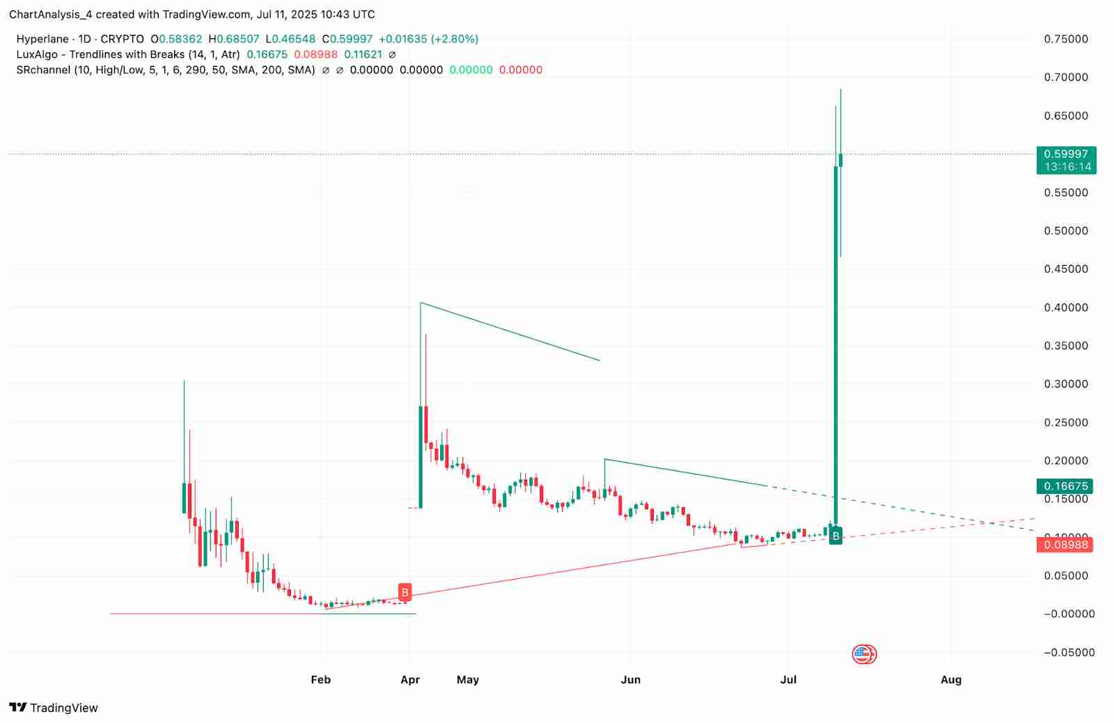 Hyperlane 价格今日稳定在 0.60 美元附近,此前在 7 月 11 日的反弹中曾触及 0.66 美元的高点。在 Upbit 和 Bithumb 上线韩元交易对,开启韩国投资者群体的大门后,该**从长期下跌结构中实现了戏剧性突破。日线图显示,Hyperlane 突破了持续数月的阻力趋势线,并获得了巨额成交量的确认。各项指标依然看涨。