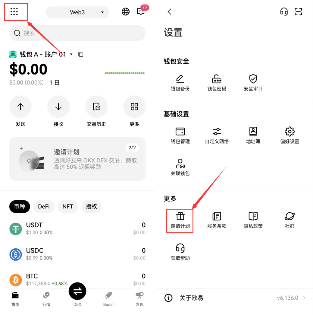 使用币安 钱包推荐码的方式,是到APP 左上角图示,找到「邀请计划」