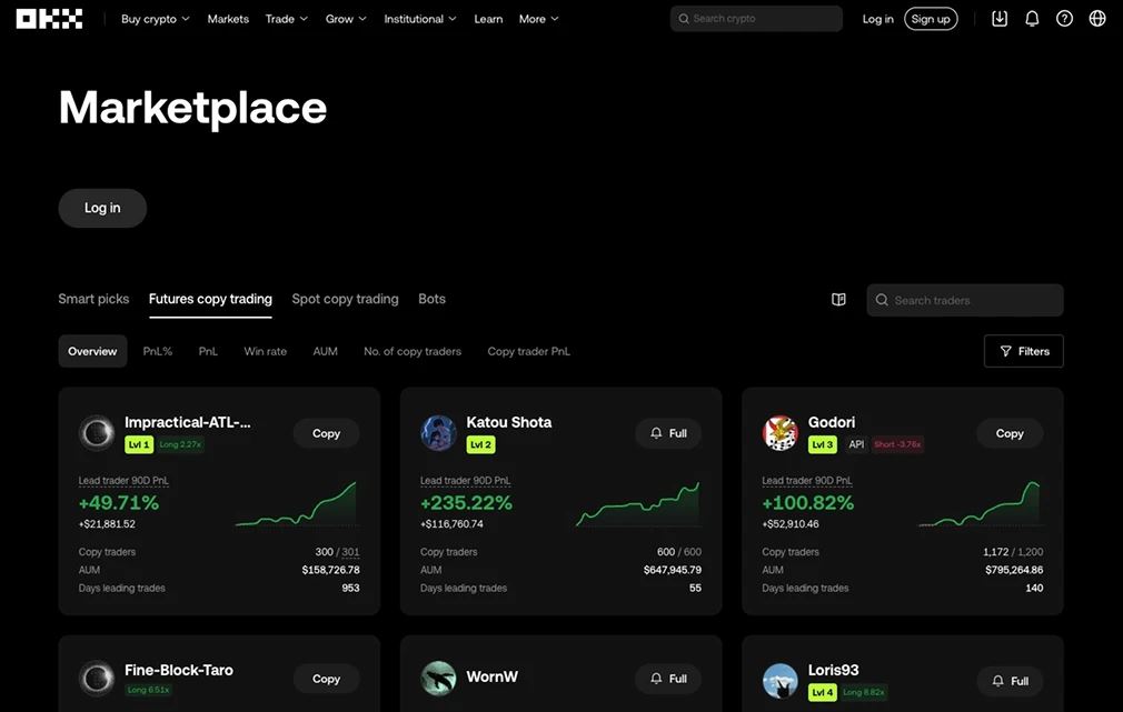 - 复制/机器人交易:适用于希望自动交易或跟随其他交易者策略的用户。包括交易机器人(如网格、DCA、投资组合再平衡)、复制交易(复制成功交易者的动作)和策略模板。