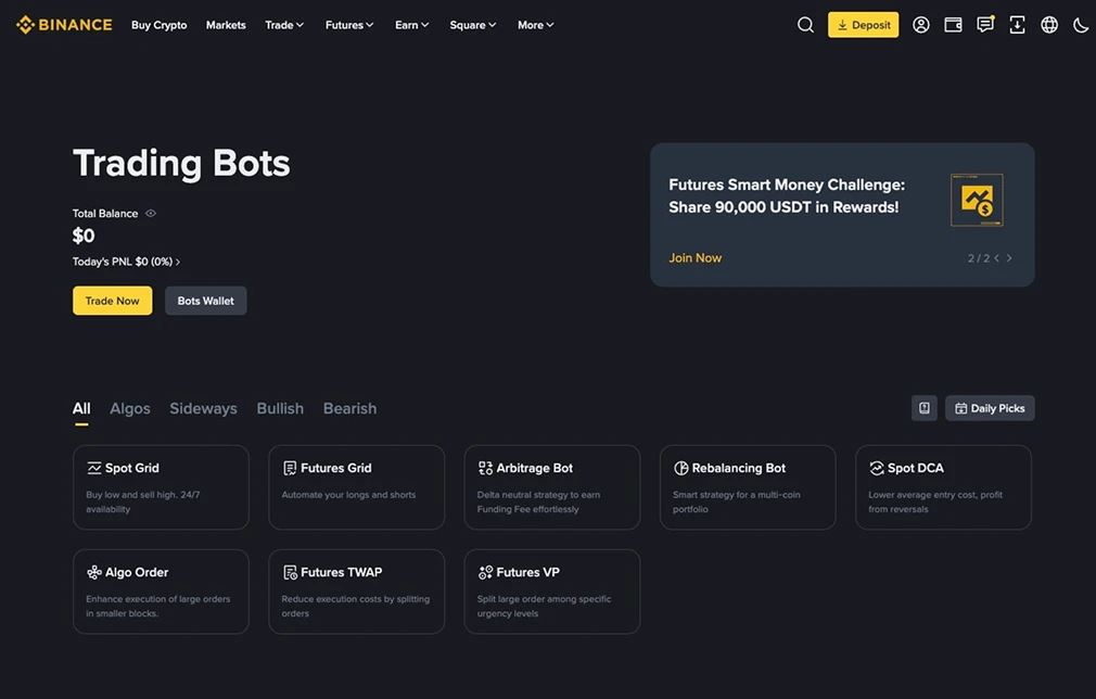 - 交易机器人:币安 提供交易机器人,允许用户全天候执行策略,无需手动输入。受欢迎的机器人包括网格交易,它可以从价格波动中获利,以及自动执行长期积累的 DCA 机器人。