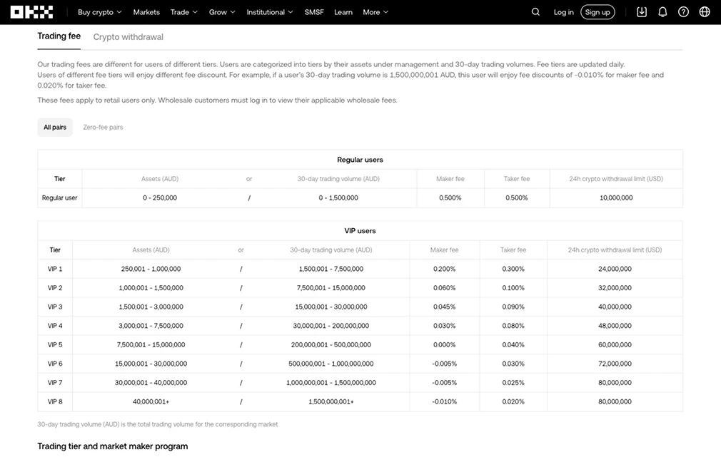 - 期货交易费用:做市商费用从 0.02% 开始,**可达 0%,而承销商费用从 0.05% 开始,** VIP 交易商费用降至约 0.0153%。