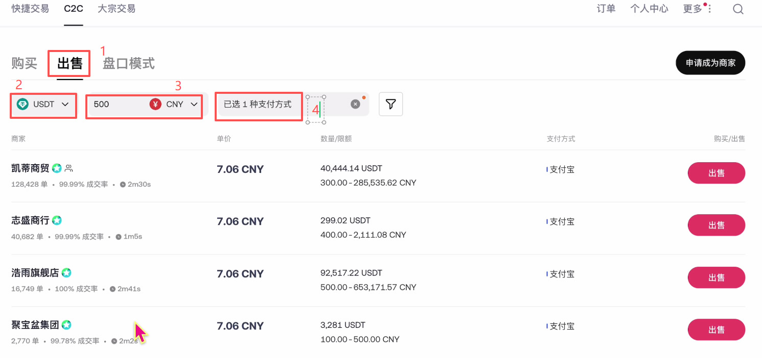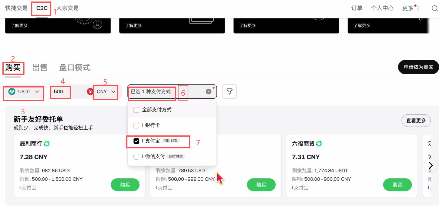 5、在上方我们选择“C2C”,也就是个人对个人交易。下方选择【购买】,要购买的币种是USDT。然后你可以在这里面去筛选一下要购买的金额,后面的CNY就是人民币的意思。比如说我们想要购买500人民币的USDT就输入500。然后选择 一下支付方式,分别有银行卡、支付宝还有微信支付,你习惯使用哪种方式支付就使用哪种方式支付。比如说我习惯使用支付宝,我就勾选“支付宝”。