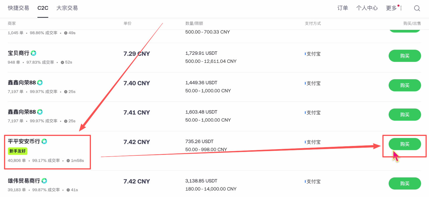 6、平台就会为我们筛选出符合要求的商家了,我们要找成单量和成交率高的商家来进行购买。我们来看一下,比如说“平平安安币行”这一家,他有一个4万单的成交量,同时他的好评率是99.17%,我们就可以跟这家来进行购买。点击后面的【购买】。
