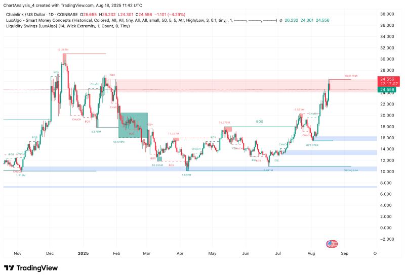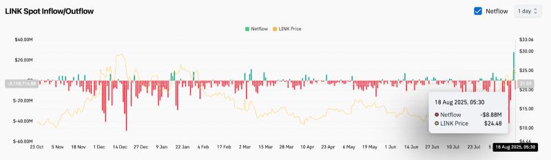 8 月 18 日,LINK 链上现货净流入量为负,约为 -890 万美元,证实了投资者在较高价位进行了小幅抛售。此次资金流出与 26 美元的回调相符,表明目前的获利回吐超过了新增持仓。
