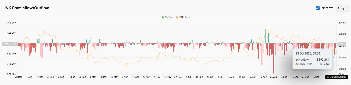 2025年10月23日,LINK交易价格接近17.59美元,录得59.234万美元的净流入,暗示短期活动重新活跃。然而,整体资金流出趋势表明抛售压力减弱,这通常预示着由增持驱动的反弹。